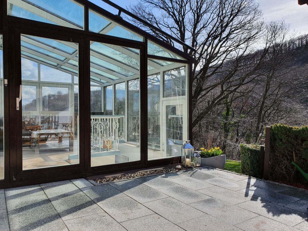 Ein lichtdurchfluteter Wintergarten lädt mit einer bequemen Wohnlandschaft zum Lesen, Entspannen und Fernsehen ein und bietet einen herrlichen Panoramablick auf die Wälder und die Ruinen der Lauenburg.