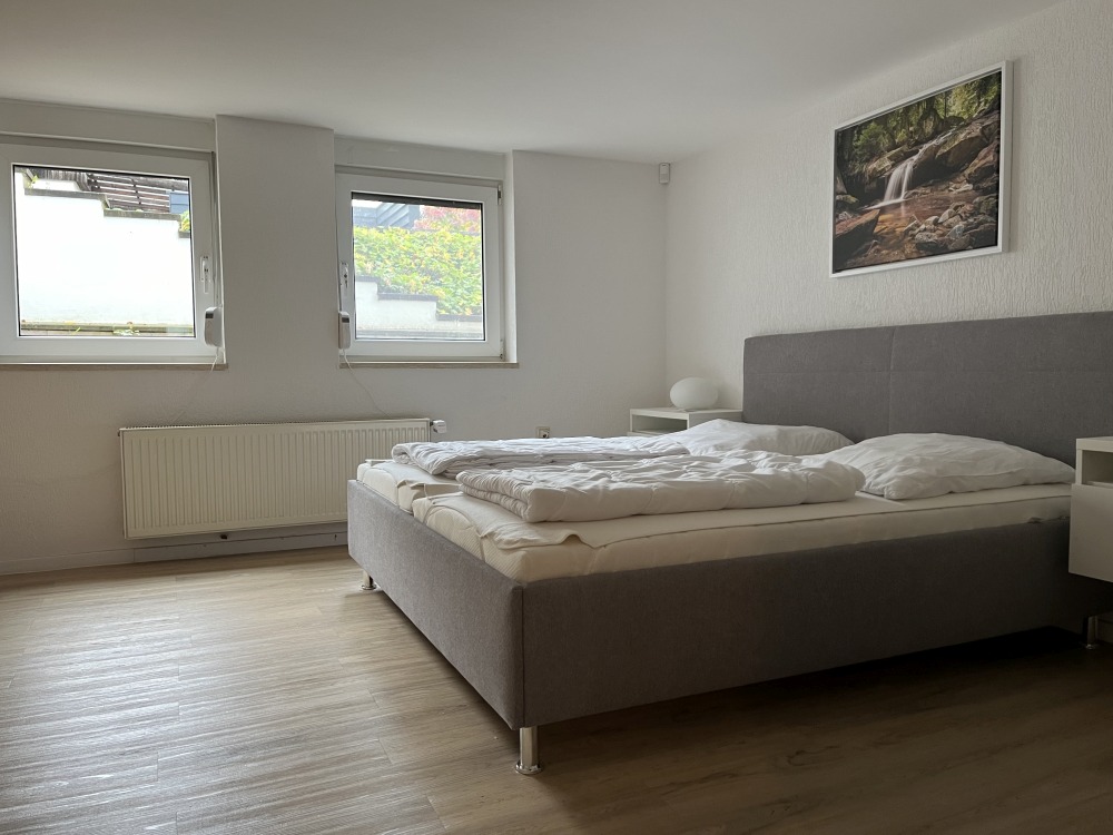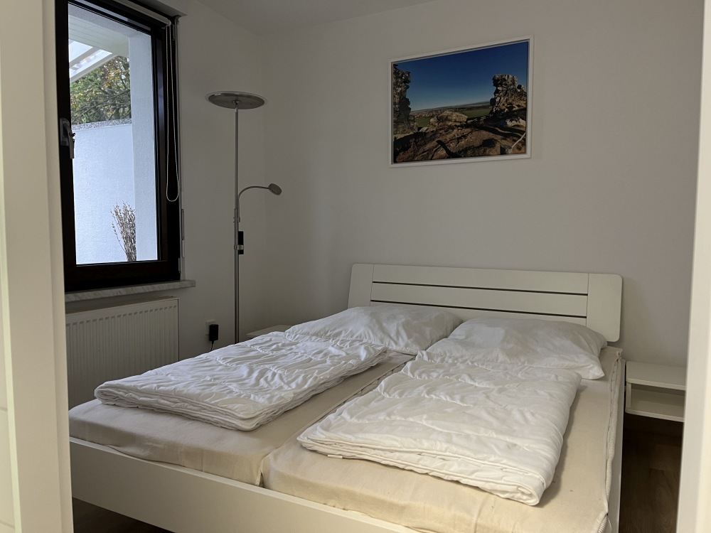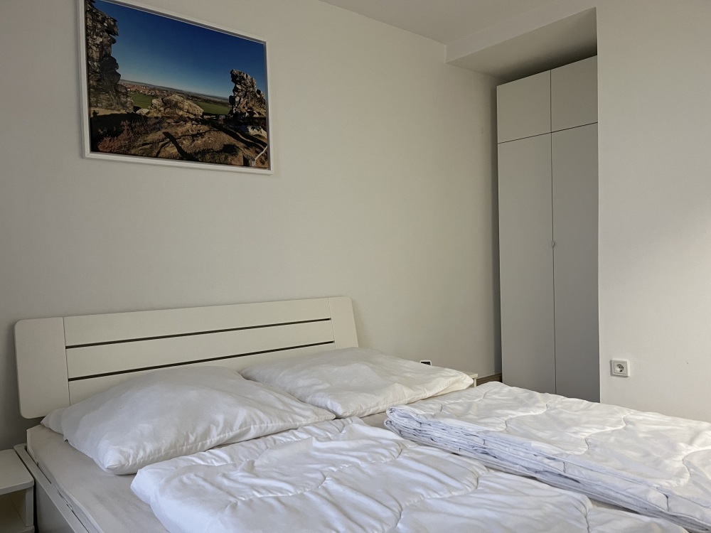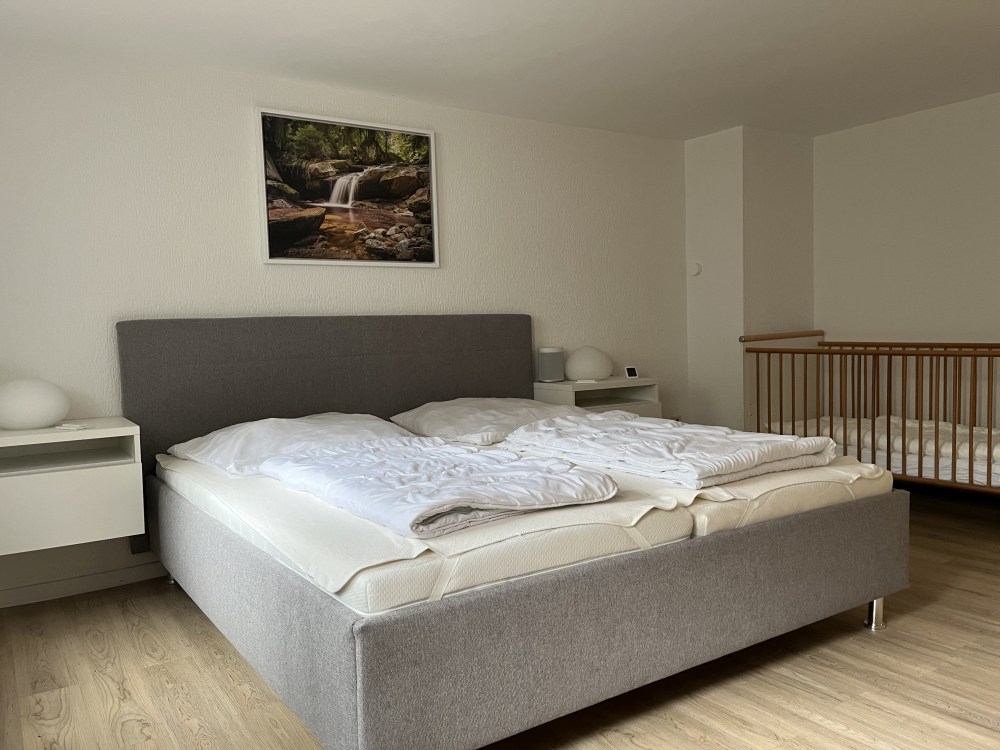 Das Gästezimmer verfügt ebenfalls über ein gemütliches Doppelbett für Sie und Ihre Kleidung findet ebenso ein passendes Plätzchen. Neben dem Gästezimmer befindet sich zudem ein Gäste-WC mit Waschmaschine und Trockner.